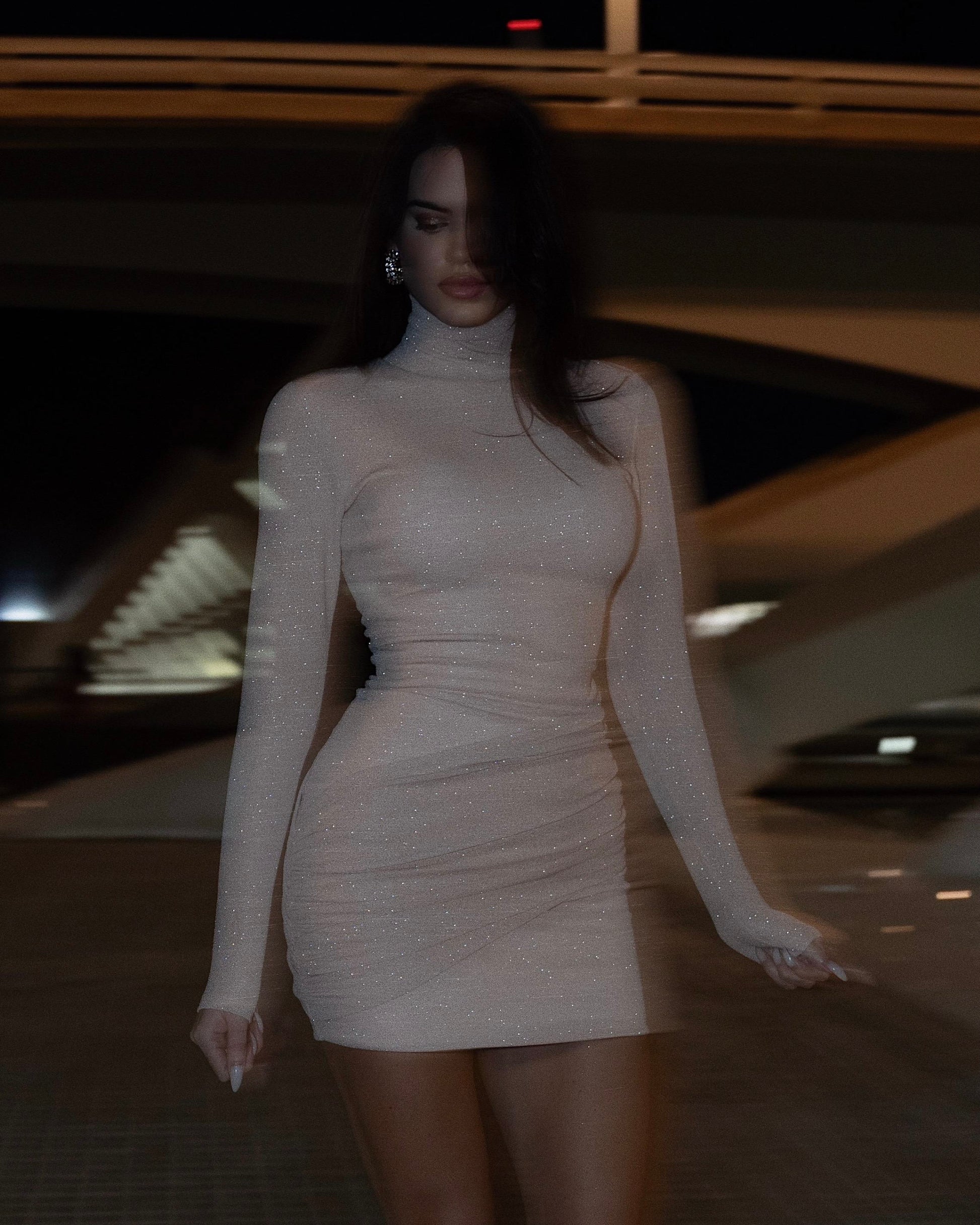 Elegantna, pripijena mini haljina koja se savršeno uklapa u večernju atmosferu. Model je izrađen od nežnog, svetlog materijala prožetog sitnim, diskretnim svetlucavim detaljima koji haljini daju glamurozan sjaj pri svakom pokretu. Visoka kragna i dugi rukavi dodaju notu sofisticiranosti, dok kroj koji prati liniju tela naglašava siluetu na prefinjen i ženstven način. Idealna haljina za večernje izlaske, proslave i sve posebne prilike gde želiš da ostaviš upečatljiv, ali elegantan utisak ✨